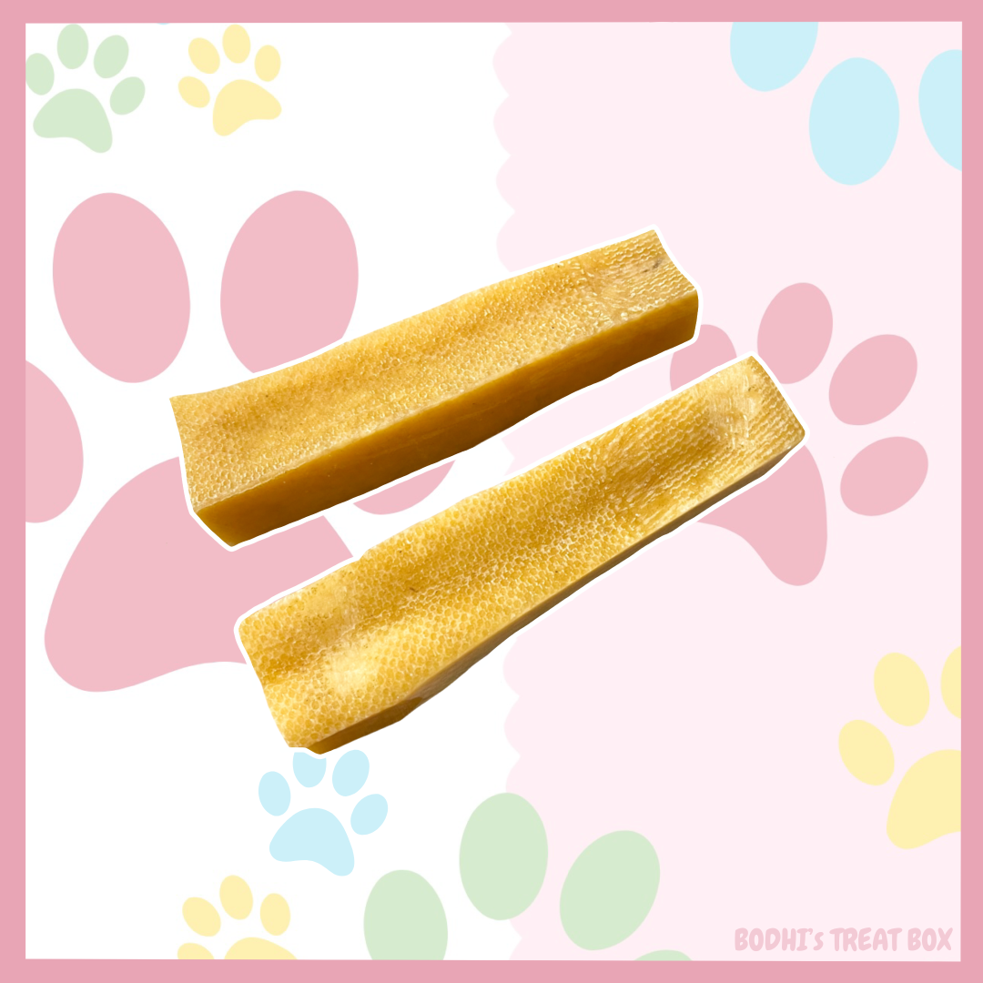𝘔𝘢𝘥𝘦 𝘧𝘳𝘰𝘮 𝘢 𝘮𝘪𝘹 𝘰𝘧 𝘴𝘬𝘪𝘮𝘮𝘦𝘥 𝘺𝘢𝘬 𝘢𝘯𝘥 𝘤𝘰𝘸 𝘮𝘪𝘭𝘬. 𝘈 𝘴𝘮𝘢𝘭𝘭 𝘢𝘮𝘰𝘶𝘯𝘵 𝘰𝘧 𝘭𝘪𝘮𝘦 𝘫𝘶𝘪𝘤𝘦 𝘢𝘯𝘥 𝘴𝘢𝘭𝘵 𝘪𝘴 𝘢𝘥𝘥𝘦𝘥 𝘵𝘰 𝘩𝘢𝘳𝘥𝘦𝘯 𝘵𝘩𝘦 𝘮𝘪𝘭𝘬, 𝘸𝘩𝘪𝘤𝘩 𝘪𝘴 𝘵𝘩𝘦𝘯 𝘤𝘰𝘮𝘱𝘳𝘦𝘴𝘴𝘦𝘥 𝘢𝘯𝘥 𝘴𝘮𝘰𝘬𝘦 𝘥𝘳𝘪𝘦𝘥 𝘧𝘰𝘳 28 𝘥𝘢𝘺𝘴 𝘵𝘰 𝘨𝘪𝘷𝘦 𝘵𝘩𝘦 𝘤𝘩𝘦𝘸𝘴 𝘵𝘩𝘦𝘪𝘳 𝘶𝘯𝘪𝘲𝘶𝘦 𝘧𝘭𝘢𝘷𝘰𝘶𝘳 𝘭𝘰𝘷𝘦𝘥 𝘣𝘺 𝘥𝘰𝘨𝘴 𝘦𝘷𝘦𝘳𝘺𝘸𝘩𝘦𝘳𝘦!